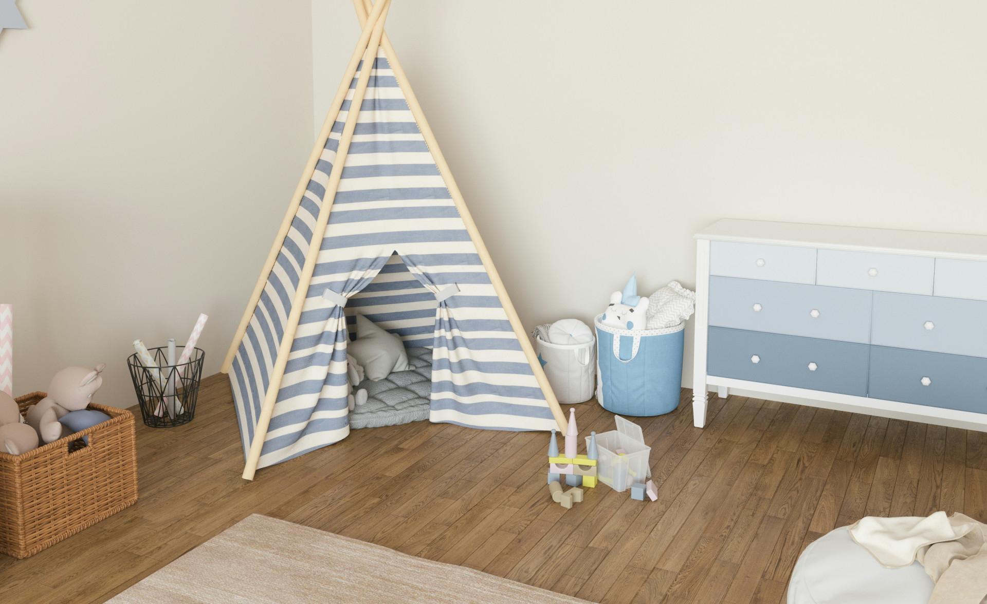 - Schlafbereich: sollte schlicht und beruhigend sein – mit neutralen Farben und natürlichen Stoffen, damit das Kind sich geborgen fühlt.